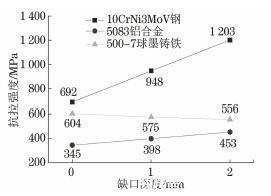 3种材料的抗拉强度-缺口深度关系曲线如图2所示。由图2可知,随着缺口深度的增加,10CrNi3MoV钢、5083铝合金的抗拉强度均增大,其中,10CrNi3MoV钢的增大幅度高于5083铝合金的,如缺口深度为2mm时,前者的抗拉强度为光滑试样的1.74倍,后者的为1.31倍。对于500-7球墨铸铁而言,抗拉强度与缺口深度的关系呈与10CrNi3MoV钢、5083铝合金相反的规律,即随着缺口深度的增加,其抗拉强度降低,缺口深度为2mm时抗拉强度为光滑试样的0.92倍。