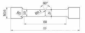 1 试验方法 试验采用10CrNi3MoV钢、5083铝合金、500-7球墨铸铁3种不同塑性的金属材料。按照GB/T 228.1—2010《金属材料 拉伸试验 第1部分:室温试验方法》的技术要求加工成R4型圆柱状拉伸试样,在试样平行段中间位置加工V形缺口,缺口角度为60°,缺口尖端半径为0.1mm,缺口根部直径D分别为6,8,10mm(对应缺口深度分别为2,1,0mm,缺口深度为0mm的试样即为光滑试样),拉伸试样的形状及尺寸见图1。