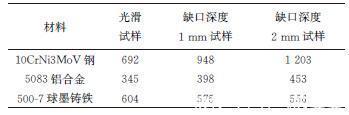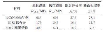 图1 拉伸试样形状及尺寸示意图 拉伸试验在电子万能试验机上进行,拉伸速度为1mm·min-1。3种材料光滑试样的拉伸试验结果见表1,可见3种材料的断后伸长率A有较大差异,10CrNi3MoV钢的断后伸长率大于5083铝合金、500-7球墨铸铁的。3种材料光滑试样及缺口试样的抗拉强度见表2,可见10CrNi3MoV钢和5083铝,合金缺口试样的抗拉强度都较光滑试样的高,500-7球墨铸铁缺口试样的抗拉强度较光滑试样的降低。表1 3种材料光滑试样的拉伸性能