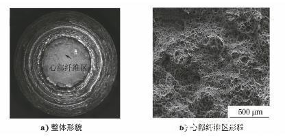 图3 10CrNi3MoV钢光滑试样和缺口试样的宏观形貌 随着缺口深度的增加,断口边缘剪切唇的面积逐渐减小,心部纤维区面积逐渐增加。缺口深度为2mm时,心部纤维区面积占比达到90%,如图4a)所示。图4b)为图4a)箭头所示区域SEM形貌,从图中可以看出,试样心部纤维区为具有正拉断裂特征的韧窝状断口,说明拉伸试样的起裂位置位于试样中心区域。